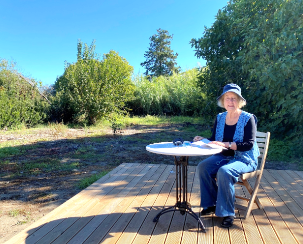 Hilde Schramm im Garten des Gästehauses in Kommeno, das zunächst von RfG gemietet war und inzwischen von Friends of Kommeno gekauft wurde. (Oktober 2024. Foto: Amar Bašić)